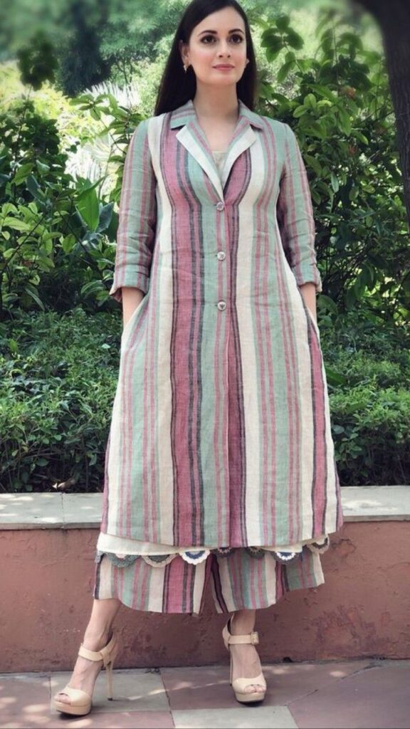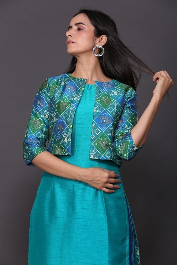 A jacket-style kurti can be stitched as a two-piece outfit — a plain inner and an embroidered or printed jacket. It gives a bold and festive appearance.
